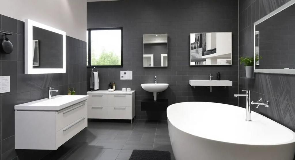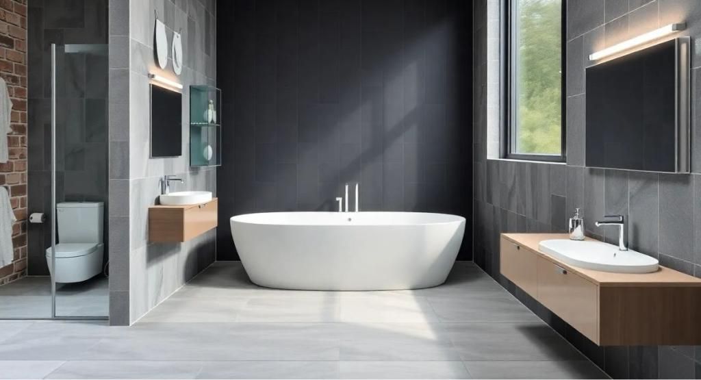 - Große Bäder vertragen dunklere Akzente und Zonenaufteilung